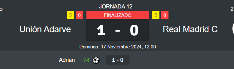El Real Madrid C se va de vacío en su visita al barrio del Pilar, cosechando una derrota por la mínima ante Unión Adarve (1-0). Debutó Álex Pérez y los juveniles Ignacio Gascón y Emanuel Benjamín.