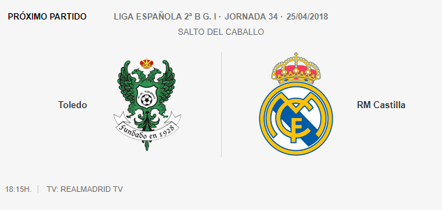 El primer filial madridista afronta este miércoles 25 de abril la jornada 34 de competición, un partido en donde esta vez jugará como visitante en Toledo, contra el C.D Toledo.
